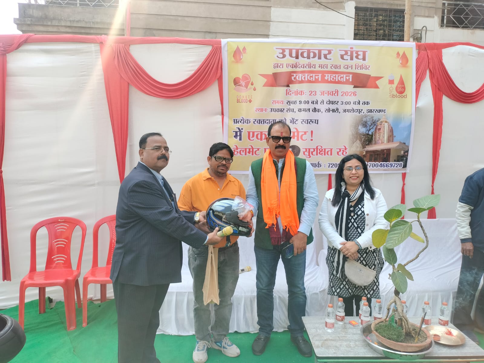 उपकार संघ एवं सोनारी थाना समिति के संयुक्त तत्वावधान में शुक्रवार को उपकार संघ के प्रांगण में सुबह 9:00 बजे से शाम तक रक्तदान शिविर का आयोजन संपन्न हो. इ आयोजन में कुल 141यूनिट रक्त का संग्रह हुआ. रक्तदाताओं का उत्साह वर्द्धन करने के लिए उन्हें सर्टिफिकेट प्रदान किए. साथ ही सड़क सुरक्षा के संदेश के साथ प्रत्येक रक्तदाता को हेलमेट प्रदान किया गया. दिन भर चले इस कार्यक्रम में अतिथिगण आते रहे और उपकार संघ के प्रांगण में मौजूद पौधे में पानी डालकर कार्यक्रम को गति प्रदान करते रहे. इस आयोजन के माध्यम से सड़क सुरक्षा के साथ-साथ पर्यावरण संरक्षण का भी संदेश दिया गया.