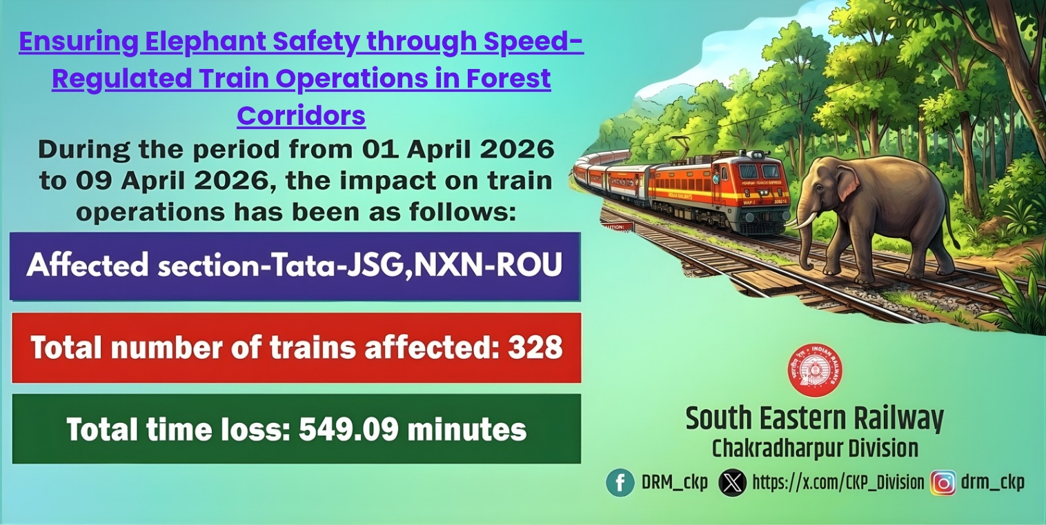 हाथियों की सुरक्षा के लिए रेलवे का बड़ा कदम: फॉरेस्ट कॉरिडोर में ट्रेनों की रफ्तार नियंत्रित, 9 दिनों में 328 ट्रेनें प्रभावित April 15, 2026 No Comments